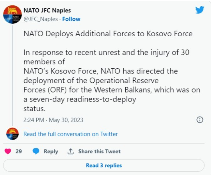 Forcat e KFOR-it do të kenë trupa shtesë në Kosovë. Si përgjigje ndaj trazirave të fundit në veri të Kosovës, dhe lëndimit të 30 pjesëtarëve të misionit të NATO-s në Kosovë (KFOR), në atë pjesë, aleanca veri-atlantike ka marrë vendim për angazhim të Forcës Operacionale Rezervë për Ballkanin Perëndimor, e cila ka qenë në gjendje gatishmërie për angazhim.