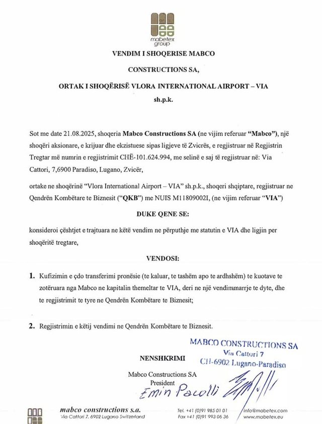 “Sot me date 21.08.2025, shoqeria Mabco Constructions SA ortake ne shoqerine “Vlora International Airport -VIA” sh.p.k vendosi kufizimin e çdo transferimi pronesie (te kaluar, te tashem apo te ardhshem) te kuotave te zoteruara nga Mabco ne kapitalin themeltar te VIA, deri ne nje vendimmanje te dyte, dhe te regjistrimit te tyre ne Qendren Kombetare te Biznesit,” thuhet në vendim.