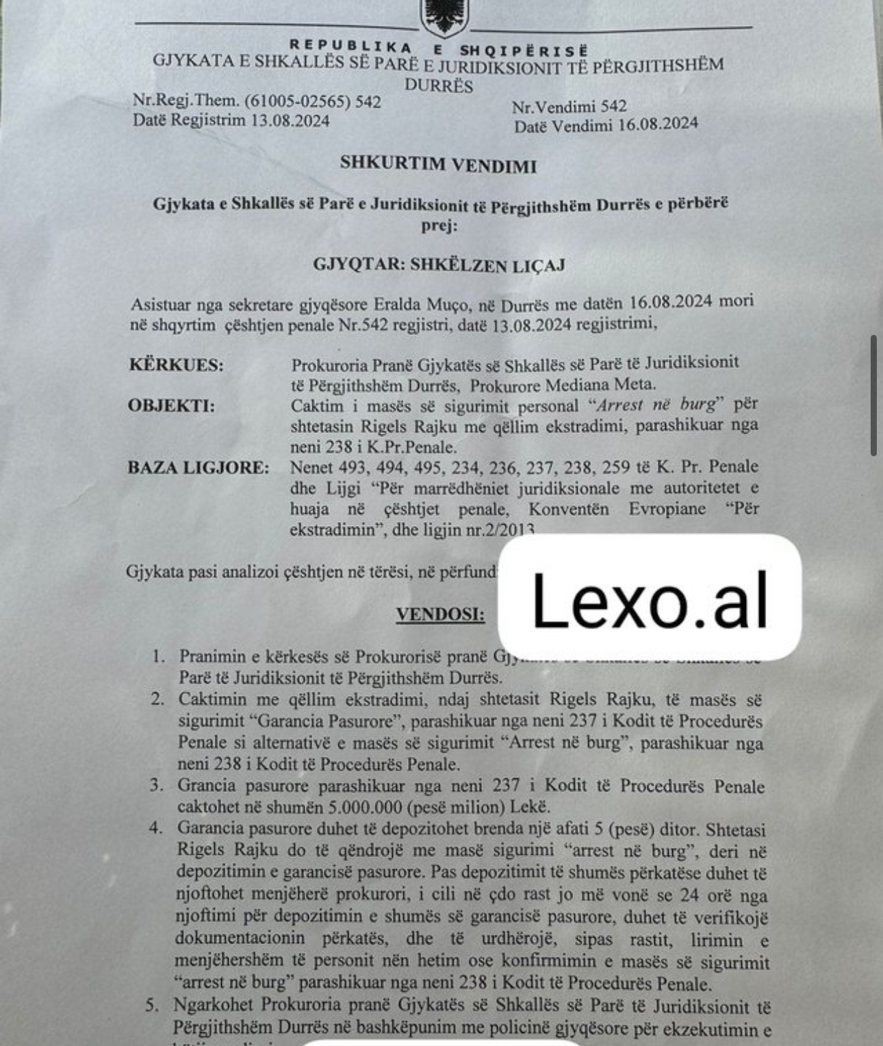 Sot u mbajt gjyqi mbi masen e Rigels Rajkut (Noizy) në Gjykatën e Durrësit. Gjykata vendosi lirimin e artistit kundrejt “Garancise Pasurore” qe ai duhet të depozitojë.