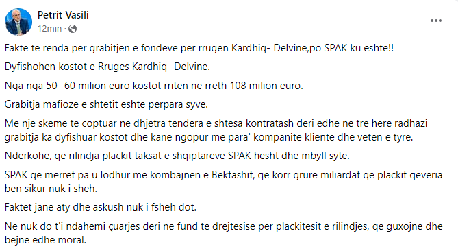 Nënkryetari i LSI-së, Petrit Vasili ka reaguar në lidhje me skandalin me kontratën 11,4 milionë euro të Autoritetit Rrugor Shqiptar për mirëmbajtjen e akseve kryesore të Rajonit Jugor.