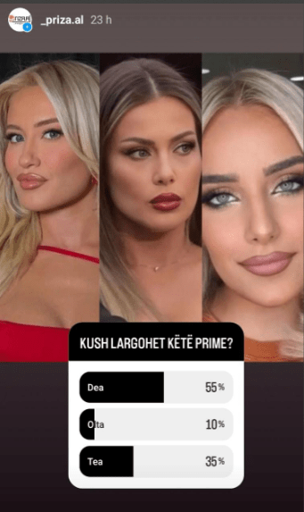 Bazuar tek nominimet, në faqen e Instagramit të Priza.al u zhvillua një sondazh. Të pyetur se cili nga banoret e BBV do të largohet nga shtëpia më e famshme në Shqipëri, shqiptarët kanë votuar: Dea Mishel me 55%, Tea Trifoni me 35% dhe Olta Gixhari me 10%.