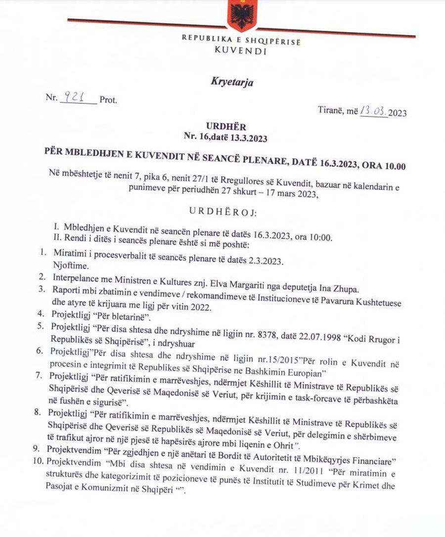 Në rendin e ditës përfshihet interpelanca e deputetes së PD, Ina Zhupa për ministren e Kulturës Elva Margariti. Në kërkesën e saj, Zhupa tha se prej mungesës së vëmendjes kanë degraduar monumentet e trashëgimisë kulturore dhe sipas saj, industria e ndërtimit po dëmton pasurinë kulturore të shqiptarëve.