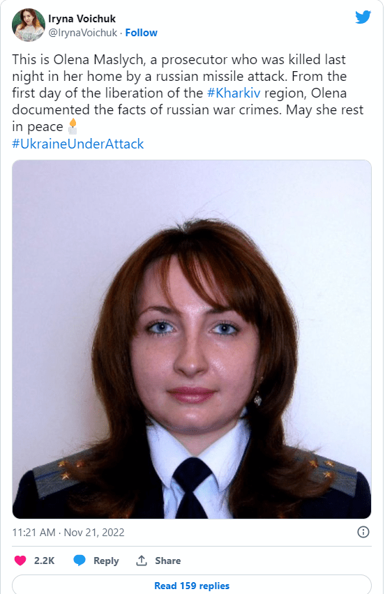 Një deklaratë nga zyra e prokurorit rajonal të Kharkiv tha: “Ne shprehim ngushëllimet tona të sinqerta për familjen dhe miqtë e prokurores Olena Maslych, e cila vdiq si rezultat i zjarrit me raketa ruse”.