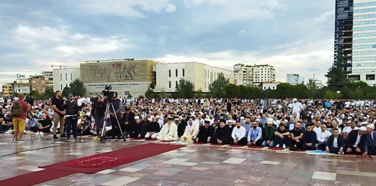 Mijëra besimtarë falin Namazin e Bajramit në sheshin Skënderbej/ Kreu i KMSH: Mos e braktisni vendin