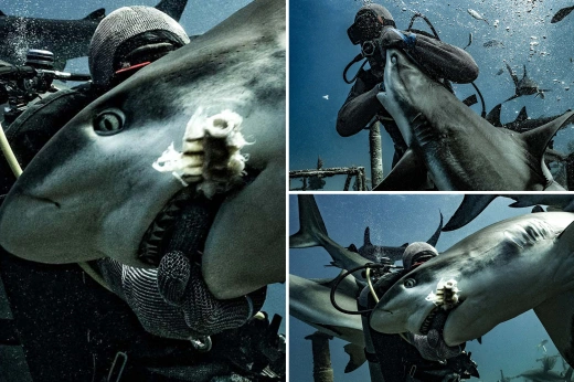 FOTO/ I rrethuar nga 20 ‘bisha’ deti… Momentet e frikshme kur peshkaqeni gjigant kafshon dorën e zhytësit