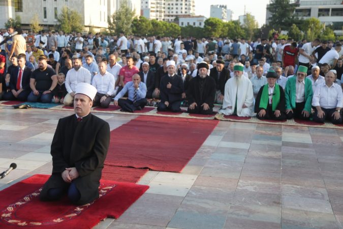 Mijëra besimtarë falin Namazin e Bajramit në sheshin Skënderbej/ Kreu i KMSH: Mos e braktisni vendin