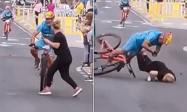 Gara për pak përfundon në tragjedi/ Gruaja futet në pistë, çiklisti e merr ‘përpara’ (VIDEO)