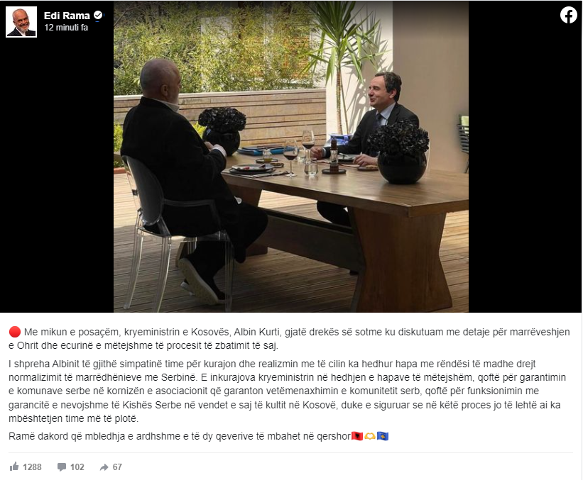 Kryeministri Edi Rama ka reaguar pas takimit me homologun e Kosovës, Albin Kurti. Përmes një postimi në Facebook, ai ka treguar se kanë diskutuar për marrëveshjen e Ohrit dhe ecurinë e mëtejshme të procesit të zbatimit të saj.