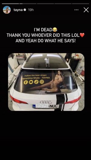 Këtë herë ndryshe nga dedikimet me letra apo gjeste nëpër koncerte, një fans ka zgjedhur një mënyrë të veçantë për ta përkrahur artisten e preferuar. Një person ka vendosur në xhamin e pasëm të makinës së tij një pankartë të madhe, ku duket Tayna dhe afishimi i rrjeteve të saj sociale.