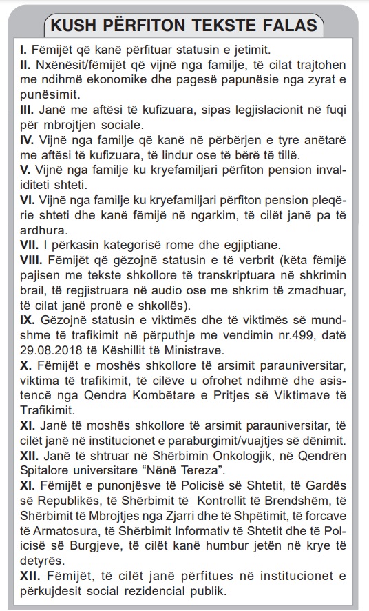 Janë 12 kategori familjesh që konsiderohen në nevojë, të cilat arrijnë të marrin mbrapsht shumën që paguajnë për tekstet shkollore në krye të herës. Ato janë të përcaktuara qartë me vendim qeverie, nr.474, datë 30.07.2021, në të cilin listohen kategoritë (në tabelën përbri).