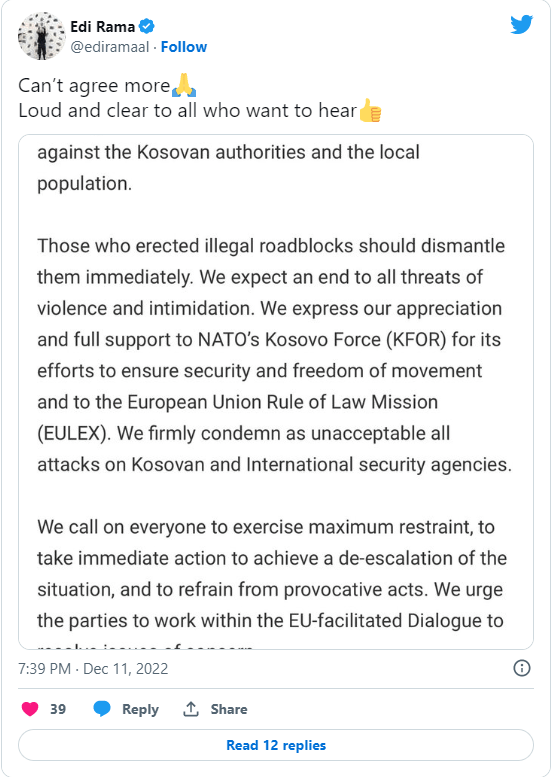Ata që ngritën postblloqe të paligjshme duhet t’i çmontojnë ato menjëherë. Ne presim që t’i jepet fund të gjitha kërcënimeve të dhunës dhe frikësimit. Ne shprehim mirënjohjen dhe mbështetjen tonë të plotë për Forcën e NATO-s në Kosovë (KFOR) për përpjekjet e saj për të garantuar sigurinë dhe lirinë e lëvizjes dhe për Misionin e Bashkimit Evropian për Sundimin e Ligjit (EULEX). Ne i dënojmë fuqishëm si të papranueshme të gjitha sulmet ndaj agjencive të sigurisë kosovare dhe ndërkombëtare”, thuhej ndër të tjera në deklaratë.
