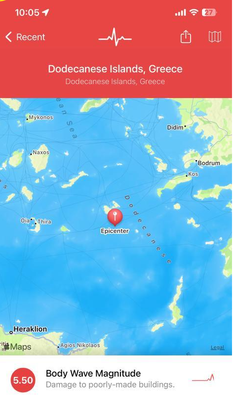 Tërmeti ka qenë i magnitudës 5.5 me epiqendër në ishullin Dodecanes, ndërsa thellësia ka qenë 100 kilometra.