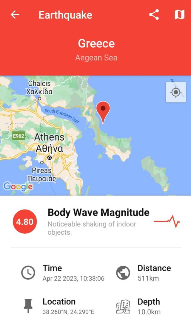 Epiqendra e tërmetit është në Detin Egje, pranë kryeqytetit, Athinë.