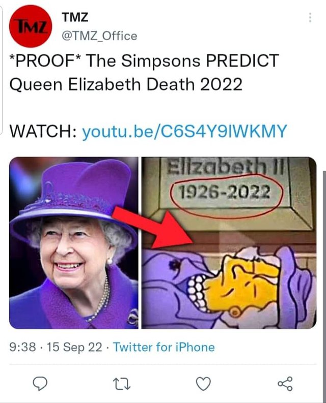Pas ndarjes nga jeta të Mbretëreshës Elizabeth II, përdoruesit e rrjeteve sociale, por edhe shumë media të huaja kanë shpërndarë masivisht një foto ku pretendohet se seriali shumë i famshëm i animuar (shumë i famshëm edhe për parashikimet e tij) “The Simpsons” ka parashikuar vdekjen e Mbretëreshës.