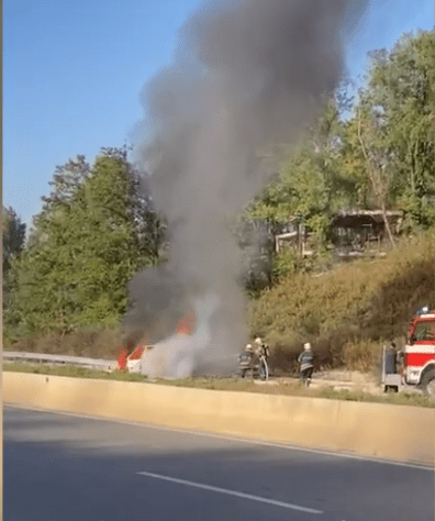 Siç shihet edhe në video makina ndodhet në krahë të rrugës ndërsa vijon të digjet nga flakët.