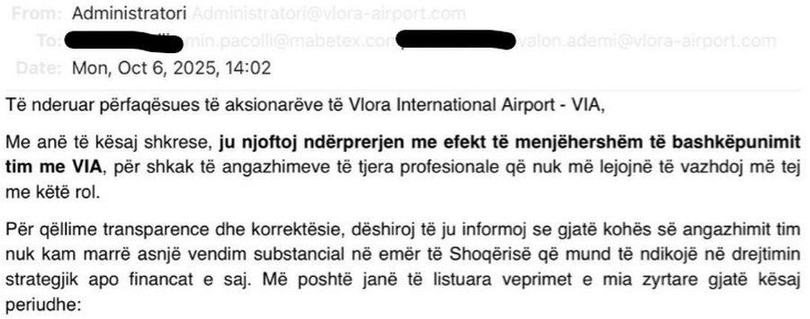 “Duke filluar nga data e këtij njoftimi, heq dorë nga çdo përgjegjësi ligjore, financiare dhe morale për çdo vendim, veprim apo marrëveshje që mund të ndërmerret nga ana juaj apo në emër të këtij bashkëpunimi të mëparshëm.”