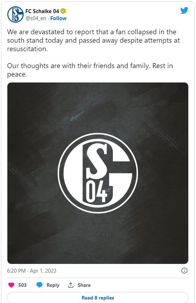 “Jemi të shkatërruar kur raportojmë se një tifoz u rrëzua në tribunë sot dhe ndërroi jetë, pavarësisht tentativave për ringjallje. U prefsh ne paqe”,- tha përmes Twitter klubi i Schalke.