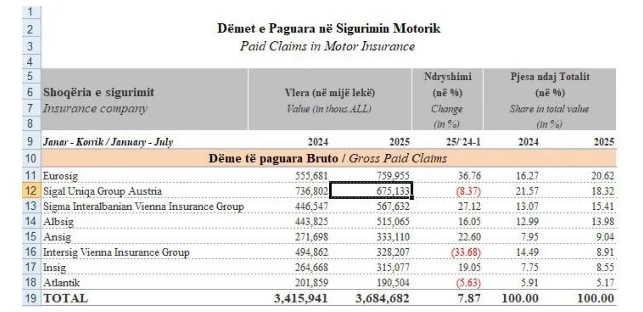Në të njëjtën periudhë, dëmet e paguara bruto arritën në vetëm 4.804 milionë lekë, me një rritje qesharake prej 0.9% krahasuar me një vit më parë.