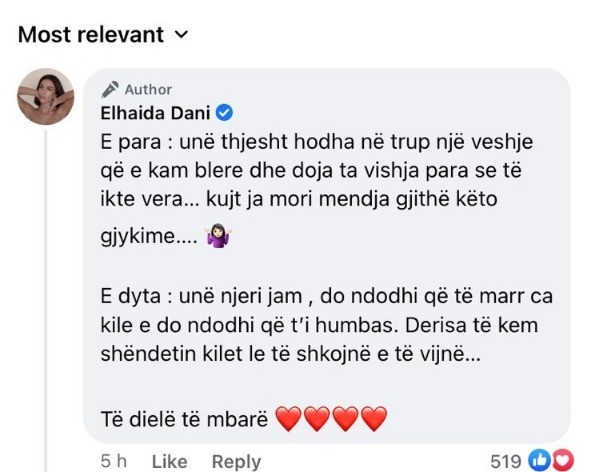 Dhe në fakt komentet kanë nxitur një reagim edhe nga ana e vetë këngëtares, e cila shkruan se është e habitur nga gjithë gjykimet që ka marrë. “E para: unë thjesht hodha në trup një veshje që e kam blerë dhe doja ta vishja para se të ikte vera… kujt ja mori mendja gjithë këto gjykime… E dyta: unë njeri jam, do ndodhi që të marr ca kile e do ndodhi që t’i humbas. Derisa të kem shëndetin kilet le të shkojnë e të vijnë… Të dielë të mbarë ”- thuhet në reagimin e plotë të Elhaida Danit.