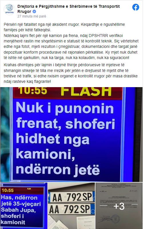 Ndërkaq lajmi flet për një kamion pa frena, ndaj DPSHTRR verifikoi menjëherë rastin me shqetësimin e statusit të kontrollit teknik. Siç vërtetohet edhe nga fotot, mjeti rezulton i çrregjistruar, dokumentacioni dhe targat janë depozituar konform procedurave në rajonalen përkatëse. Ky mjet nuk duhet të ishte në qarkullim, nuk ka targa, nuk ka kolaudim, nuk ka siguracion!