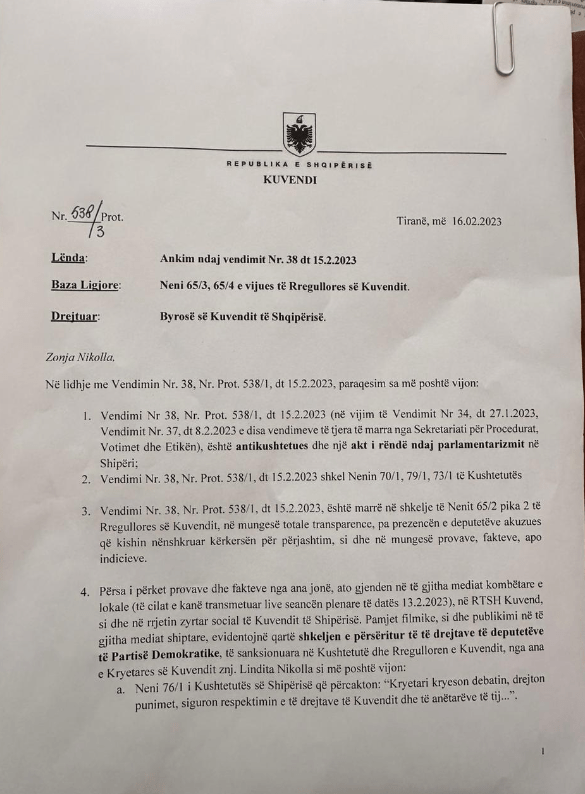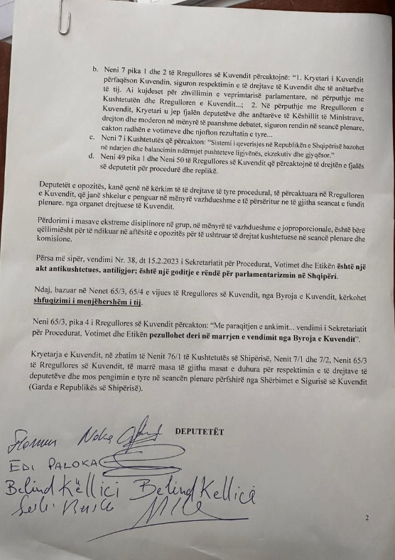 Në këtë kërkesë për ankimim, të firmosur nga Flamur Noka, Edi Paloka dhe Belind Këlliçi, kërkohet shfuqizimi i menjëhershëm i vendimit, ndërsa thuhet se deputetët e PD të cilët janë përjashtuar, nuk kanë thyer asnjë rregullore.