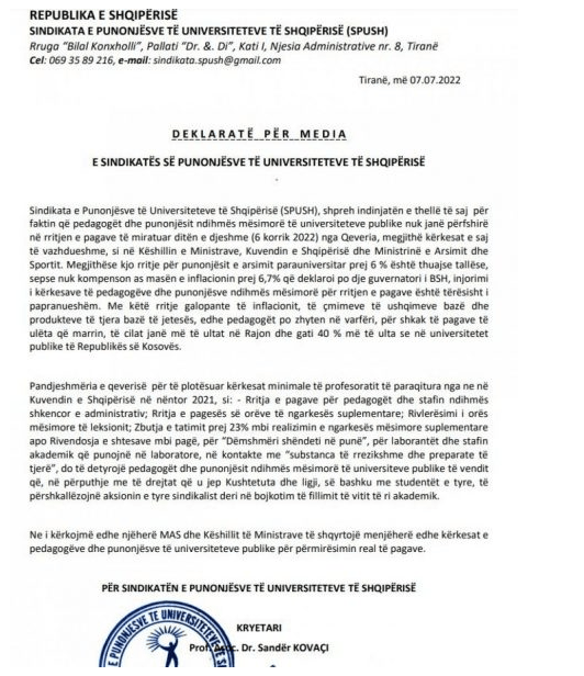 “Pandjeshmëria e qeverisë për të plotësuar kërkesat minimale të profesoratit të paraqitura nga ne në Kuvendin e Shqipërisë në nëntor 2021 si rritja e pagave për pedagogët dhe stafin ndihmës shkencor e administrativ, rritja e pagesës së orëve të ngarkesës suplementare, rivlerësimi i orës mësimore të leksionit, zbutja e tatimit prej 23% mbi realizimin e ngarkesës mësimore suplementare apo rivendosja e shtesave mbi pagë për “Dëmshmëri shëndeti në punë”, për laborantët dhe stafin akademik që punojnë në laboratore, në kontakte me “substanca të rrezikshme dhe preparate të tjerë”, do të detyrojë pedagogët dhe punonjësit ndihmës mësimorë të universitete publike të vendit që, në përputhje me të drejtat që u jep Kushtetuta dhe ligji, së bashku me studentët e tyre, të përshkallëzojnë aksionin e tyre sindikalist, deri në bojkotim të fillimit të vitit të ri akademik. Ne i kërkojmë edhe njëherë MAS dhe Këshillit të Ministrave të shqyrtojë menjëherë edhe kërkesat e pedagogëve dhe punonjësve të universiteteve publike për përmirësimin real të pagave“, shkruhet në deklaratë.