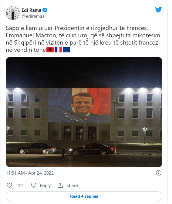 Kryeministri i vendit, Edi Rama ka i ka uruar fitoren presidentit të rizgjedhur të Francës, Emmanuel Macron.