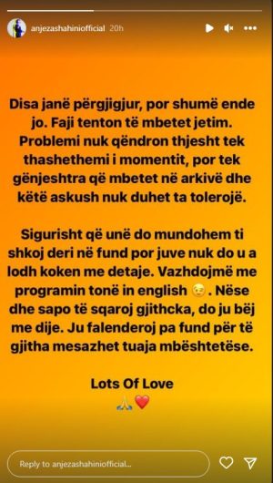 “Keni të ‘drejtën’ tuaj për të kërkuar falje publike për lajmin e gënjeshtërt, dëm-prurës ndaj imazhit tim publik, lajm i krijuar nga imagjinata juaj djallëzore. Kërkoj të fshini shpikjen tuaj nga websitet dhe rrjetet sociale e shëmtuara që menaxhoni dhe të përgënjeshtroni urgjentisht konkluzionin tuaj reth statusit tim familjar! Edhe për ju kjo ishte shumë e ulët. Të keni turp që lëndoni një familje, dëmtoni imazhin e një vajze të rritur para syve të publikut shqiptar”, ka shkruar Anjeza.
