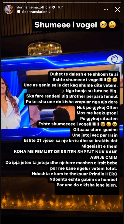 “Shumëëë i vogël! Duhet të dalësh e të shkosh te ai. Është shumë i vogël. Unë as qenin se lë dot kaq ditë vetëm. Nga Booja (qeni) nuk u futa në Big. S’ka fare rëndësi Big Brother përpara fëmiut. Po të isha unë do kisha vrapuar nga ajo derë. Nuk po gjykoj Oltën, mos më keqkuptoni, po gjykoj situatën. Është shumëëëë i vogëlllllllll. Olta çfar guximi. Unë jetoj vetëm për Irsin. Është 21-vjeç, sa një krriç dhe se braktis dot.