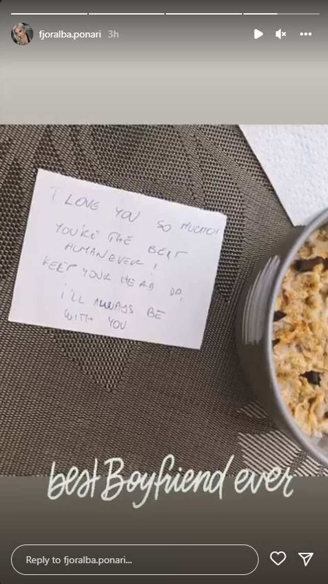 “Të dua shumë! Ti je njeriu më i mirë. Mbaje kokën lartë, unë do të jem gjithmonë me ty,”-shkruhet në pusullë. Ndërsa Fjoralba ka vendosur mbishkirmin “i dashuri më i mirë” në Instastory.