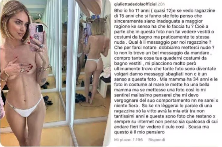 Jam thuajse 12-vjeçe dhe kur shoh adoleshente 15-vjeçare që bëjnë kështu fotosh, më duken të papërshtatshme. Nuk e kuptoj pse pikërisht ti poston diçka të tillë? Nuk është se po ekspozon veshje apo rroba banje, je praktikisht nudo. Cili është mesazhi për ne vajzat e vogla, që duhet të zhvishemi për të rënë në sy? Nuk më duket aspak një mesazh i bukur për t’u përcjellë. Blej shumë nga gjërat e tua, fletore, rroba banje, veshje, por kohët e fundit vërej se këto foto janë bërë shumë vulgare dhe nuk përçojnë më asgjë. Mamaja ime është 34-vjeçe dhe do të ndihesha shumë në siklet nëse do të postonte një foto si kjo. Vitto (duke ju referuar vajzës së Chiara-s) do të ketë moshën time pas disa vitesh dhe nuk besoj se do të ndihej krenare për ty po të të shihte kështu. Këto janë foto që ngelin gjatë në internet dhe nuk janë të bukura. Më fal, por ky është mendimi im.