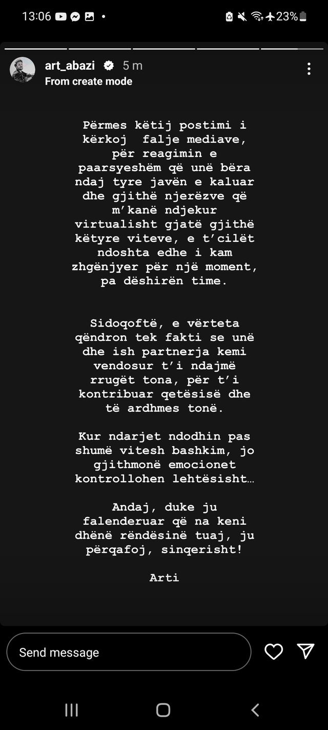 Këngëtari ështa ndar nga partnerja e tij, Rreze Qerreti me të cilen kishte më shumë se një vit në lidhje, këtë e ka konfirmuar përfundimisht Arti me shkrimin që ka bërë në instastory.