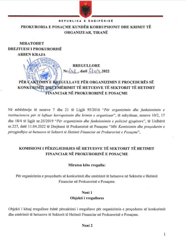 SPAK ka shpallur këtë pasdite procedurën e konkurrimit për tetë vende vakante për Hetues në Sektorin e Hetimit Financiar.
