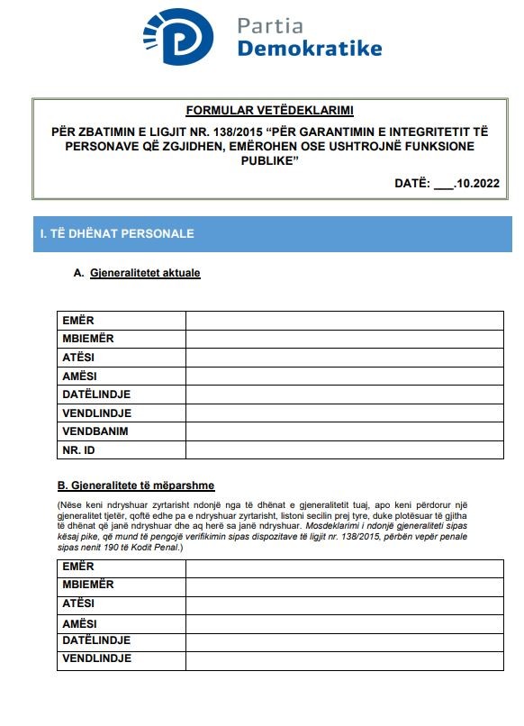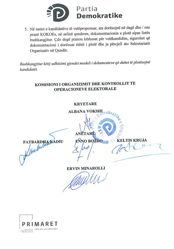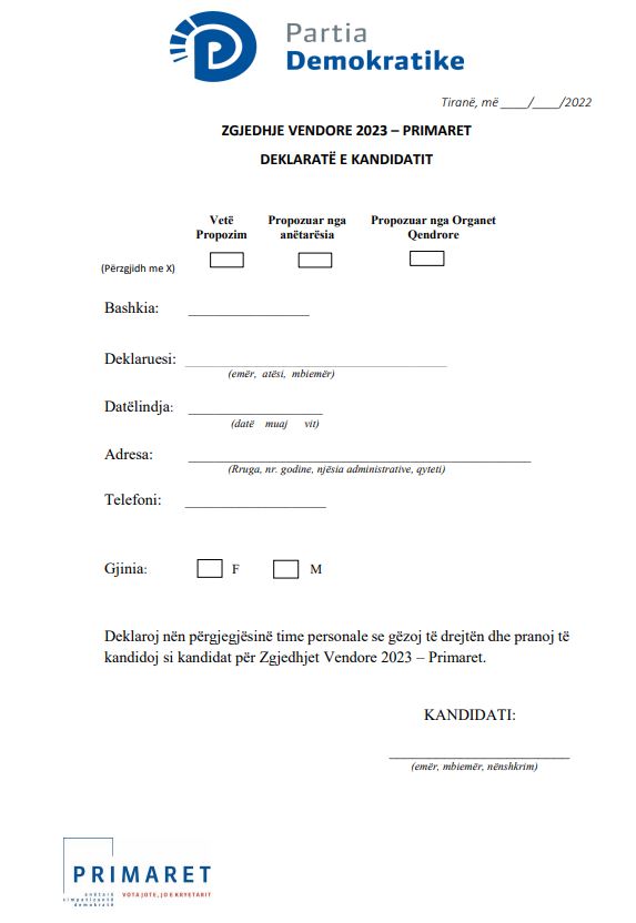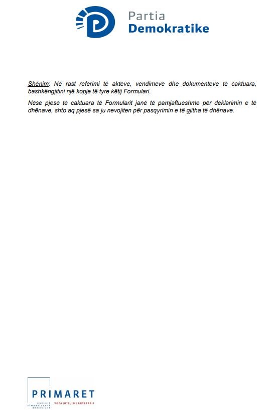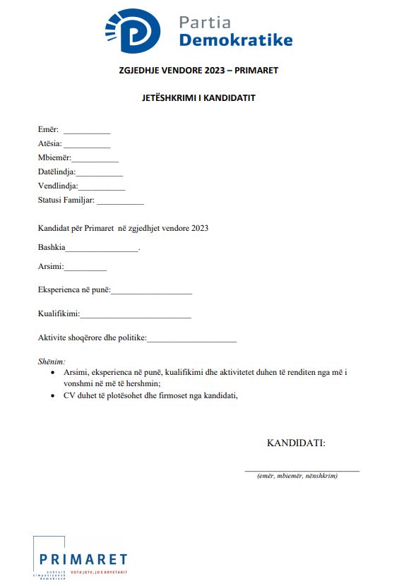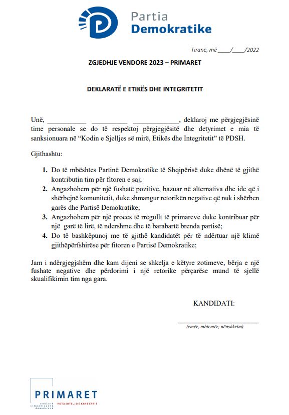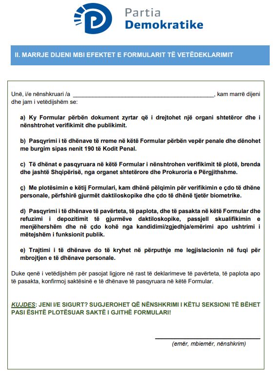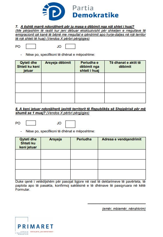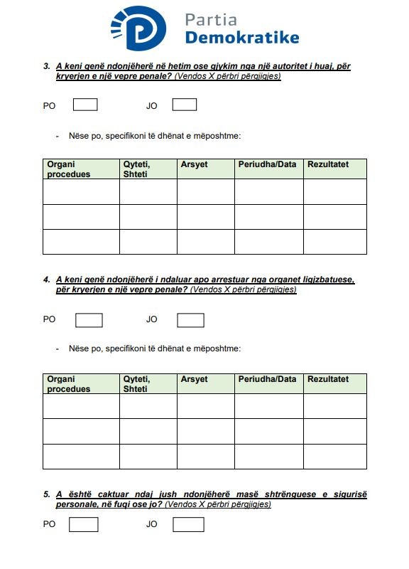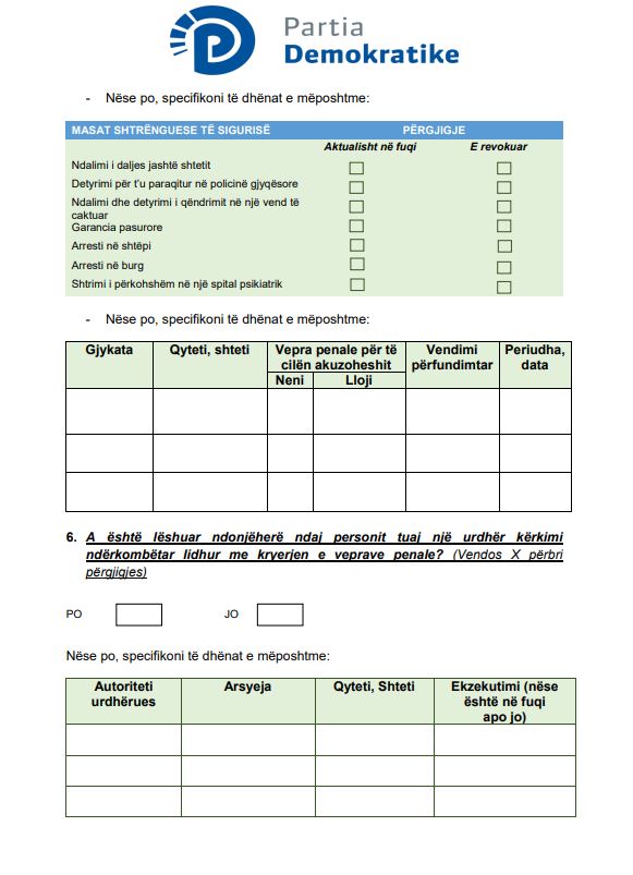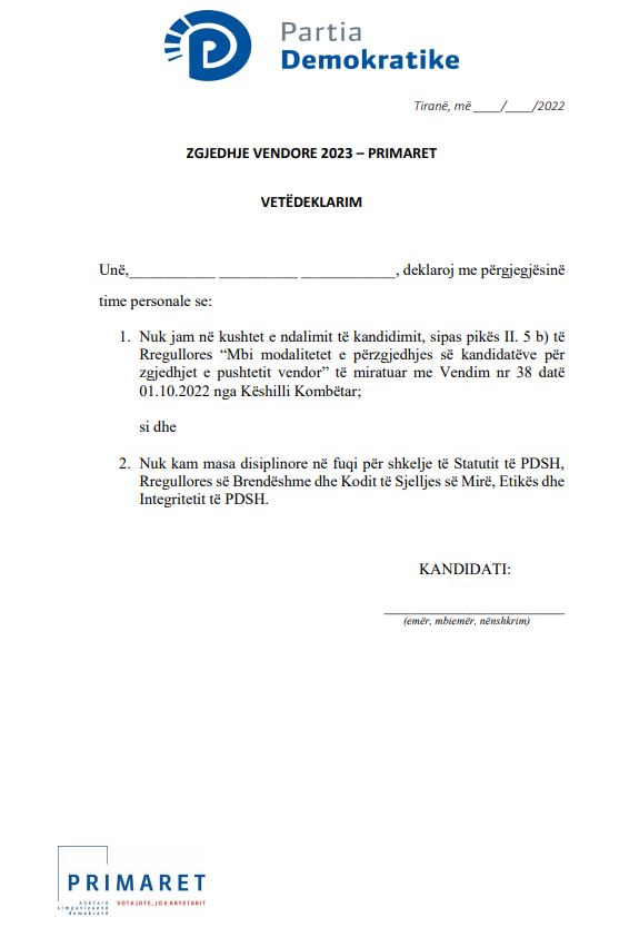 Në dokumentat e nxjerrë nga zyra e shtypit e Partisë Demokratike, bashkë me rregullat dhe kërkesat për kandidim, personat duhet të vetëdeklarojnë edhe të shkuarën e tyre, ku duket se kërkojnë një person “të pastër” dhe pa asnjë hesap të hapur me ligjin në Shqipëri apo kudo tjetër.
