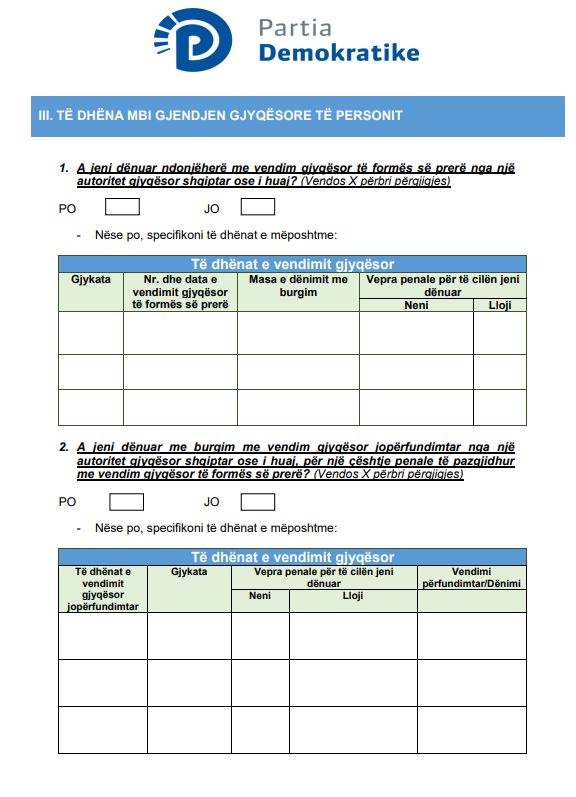 Fillimisht kandidatët duhet të pohojnë se nuk kanë masa disiplinore në fuqi për shkelje të Statutit të PDSH-së. E më pas përgjigjen për problemet me ligjin, ku kanë listuar edhe pyetjet: