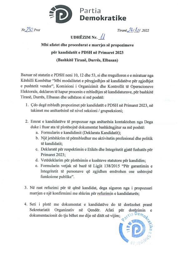 Partisë Demokratike ka publikuar një udhëzim përmes të cilit përshkruhet sesi do të zgjidhen kandidatët për zgjedhjet vendore në Tiranë, Elbasan dhe Durrës.