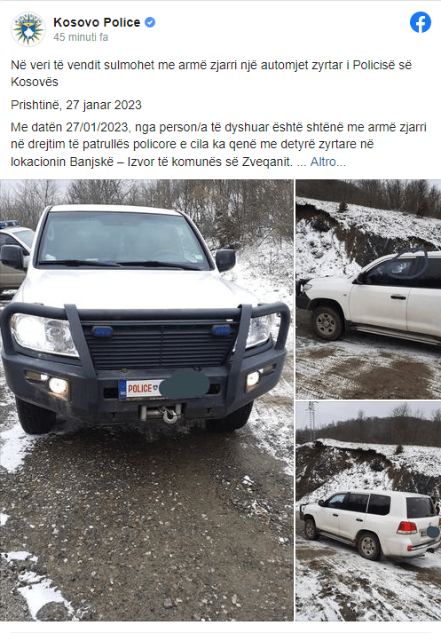 Policia e Kosovës njoftoi se persona të dyshuar kanë shtënë me armë zjarri drejt një veturë patrulluese policore në lokacionin e njohur si Banjskë, në Komunën e Zveçanit, të banuar me shumicë serbe.