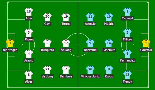 42′ L. De Jong, 84′ Fati / 25′ Vinicius, 74′ Benzema, 95′ Valverde