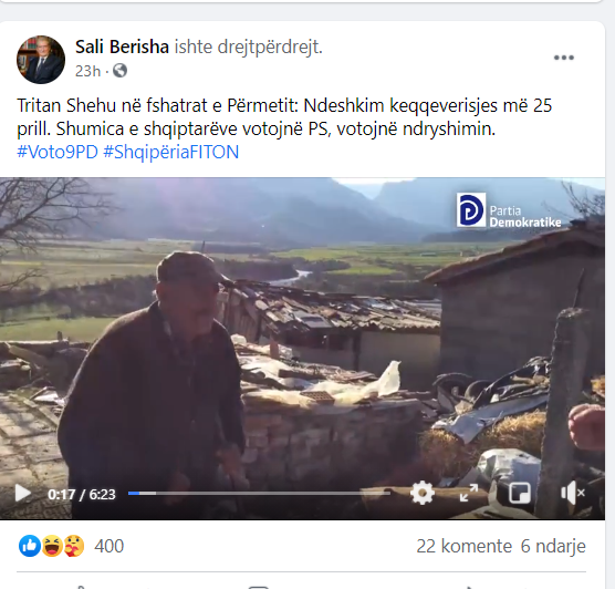 “Tritan Shehu në fshatrat e Përmetit: Ndëshkim keqqeverisjes më 25 prill. Shumica e shqiptarëve votojnë PS, votojnë ndryshimin. #Voto9PD #ShqipëriaFITON”, shkruan Berisha bashkëngjitur videos në fjalë.