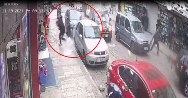 Në pamje shihet se si burri u largua nga rruga disa sekonda para se copa prej betoni të përplasjes me një makinë ku ai ishte mbështetur.