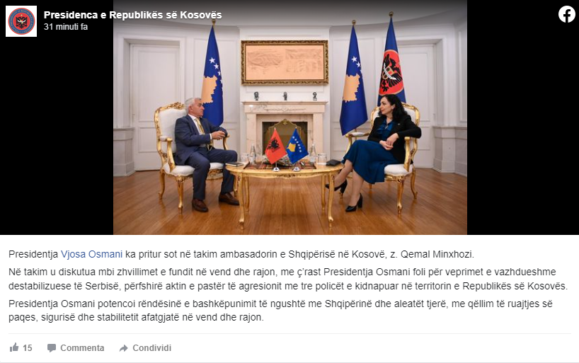 “Presidentja Vjosa Osmani ka pritur sot në takim ambasadorin e Shqipërisë në Kosovë, z. Qemal Minxhozi. Në takim u diskutua mbi zhvillimet e fundit në vend dhe rajon, me ç’rast Presidentja Osmani foli për veprimet e vazhdueshme destabilizuese të Serbisë, përfshirë aktin e pastër të agresionit me tre policët e kidnapuar në territorin e Republikës së Kosovës. Presidentja Osmani potencoi rëndësinë e bashkëpunimit të ngushtë me Shqipërinë dhe aleatët tjerë, me qëllim të ruajtjes së paqes, sigurisë dhe stabilitetit afatgjatë në vend dhe rajon”, thuhet në njoftimin e Presidencës së Kosovës.