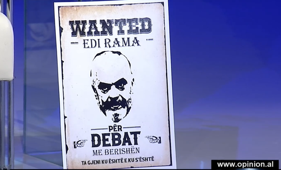 Kreu i Rithemelimit Sali Berisha që prej nisjes së fushatës elektorale ka kërkuar kryeministrin Edi Rama në një debat publik. I ftuar mbrëmjen e sotme në emisionin “Opinion”, ish-kryeministri shkoi me një tabelë me vete. Në të ishte fotoja e kryeministrit Edi Rama, tek e cila shkruhej: “Kërkohet! Kërkohet Edi Rama për një debat.”
