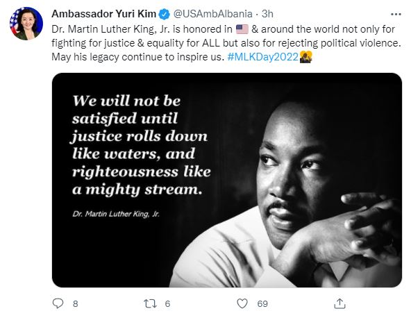 Ambasadorja e SHBA në Shqipëri Yuri Kim ka shpërndarë një mesazh në rrjetet sociale duke nderuar figurën e Martin Luther King me një mesazh për politikën shqiptare.