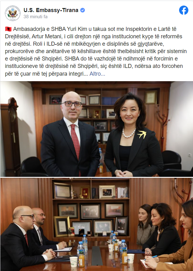 “Ambasadorja e SHBA Yuri Kim u takua sot me Inspektorin e Lartë të Drejtësisë, Artur Metani, i cili drejton një nga institucionet kyçe të reformës në drejtësi. Roli i ILD-së në mbikëqyrjen e disiplinës së gjyqtarëve, prokurorëve dhe anëtarëve të këshillave është thelbësisht kritik për sistemin e drejtësisë në Shqipëri. SHBA do të vazhdojë të ndihmojë në forcimin e institucioneve të drejtësisë në Shqipëri, siç është ILD, ndërsa ato forcohen për të çuar më tej përpara integrimin e Shqipërisë në BE”-shkruhet në njoftimin e publikuar nga ambasada amerikane.