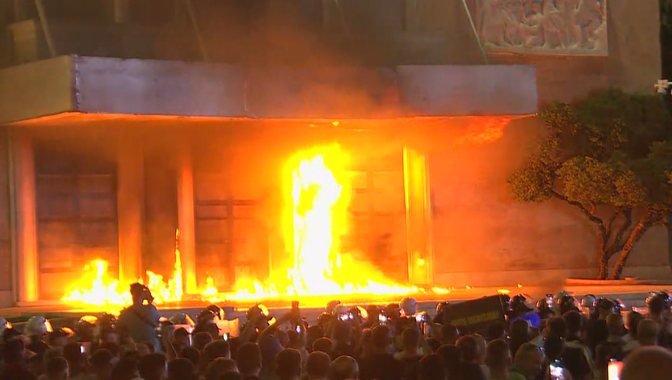 Sapo zoti Berisha nisi të fliste, nga ekranet e mëdha të vendosura në podiumin e ngritur në boulevard, drejt godinës së qeverisë nisi hedhja e molotovëve. Zhurma e shpërthimeve të tyre, së bashku me flakën dhe tymin, u bënë për disa momente sfondi i fjalës së kreut të opozitës.