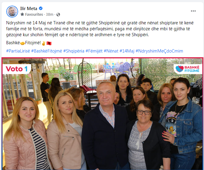 Kreu i Partisë së Lirisë Ilir Meta ka dhënë një mesazh për gratë dhe nënat shqiptare. Teksa poston një foto me gratë e vajzat, Meta shkruan se duhet të ketë ndryshim më 14 maj në të gjithë Shqipërinë që gratë dhe nënat shqiptare të kenë familje më të forta, mundësi më të mëdha përfaqësimi.