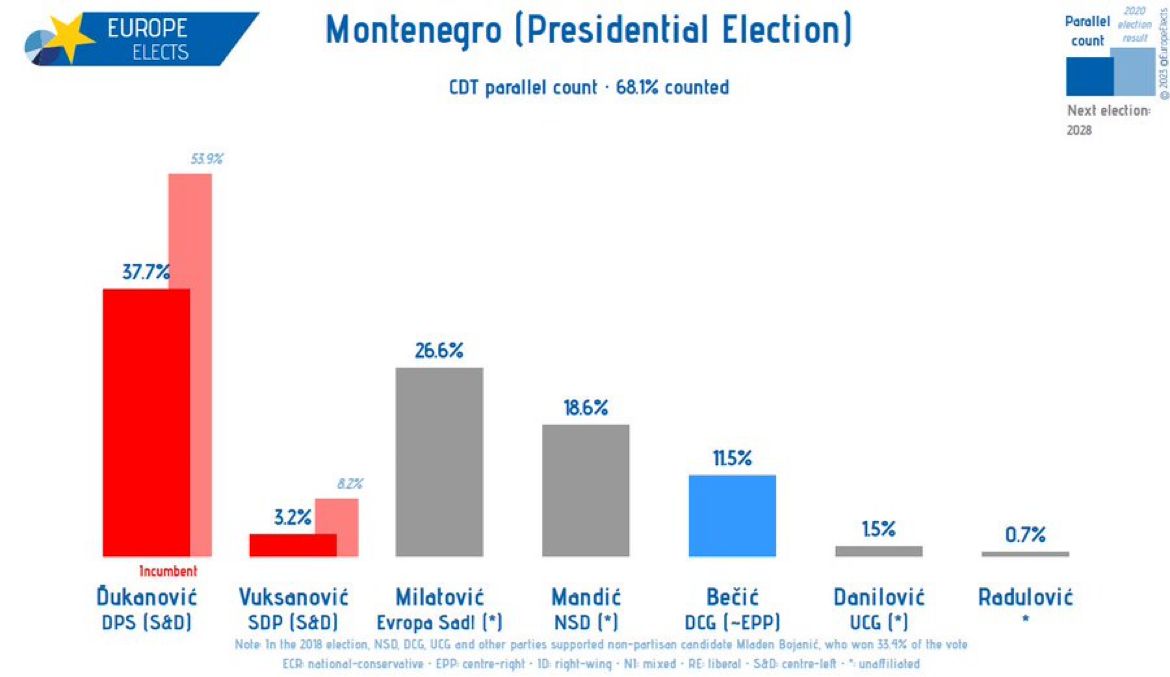 Kandidati i Lëvizjes Evropa Tani Jakov Milatoviç fitoi 26,8 përqind, Fronti Demokratik Andrija Mandiç 20 përqind, Mali i Zi Demokratik Aleksa Beçiç 11,7 përqind.