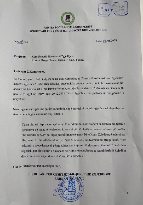“Të na vini në dispozicion një kopje të vendimit të Komisionerit së bashku me listën e personave që mund të emërohen kryesisht për të plotësuar vendet vakante për anëtar dhe sekretar të KQV-së, sipas përcaktimeve të nenit 36 të Kodit Zgjedhor, të ndryshuar dhe nenit 11 të udhëzimit nr. 2, datë 5.12.2020, të Komisionit Rregullator, “Në caktimin e procedurave të përzgjedhjes dhe trajnimit të shtetasve që mund të emërohen kryesisht për plotësimin e vakancave në Komisionet e Zonës së Administrimit Zgjedhor dhe Komisionet e Qendrave të Votimit”, i ndryshuar”, thuhet në kërkesën drejtuar KQZ-së.”