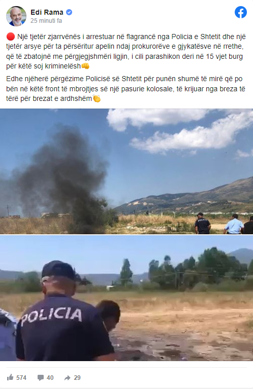 Kryeministri i Edi Rama ka ndarë në Facebook një rast të arrestimit të një piromani të pyjeve të vendit.