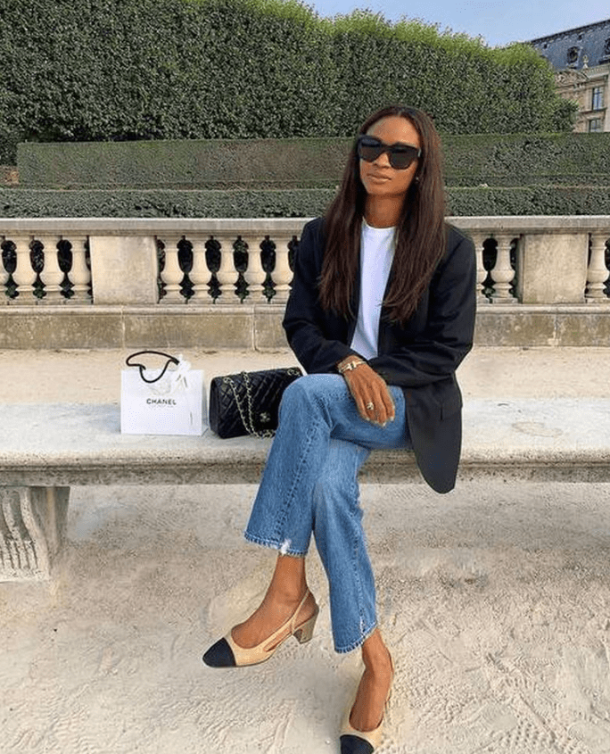 Uniforma klasike: xhaketë, xhinse dhe T-shirt i bardhë me këpucë balerinë